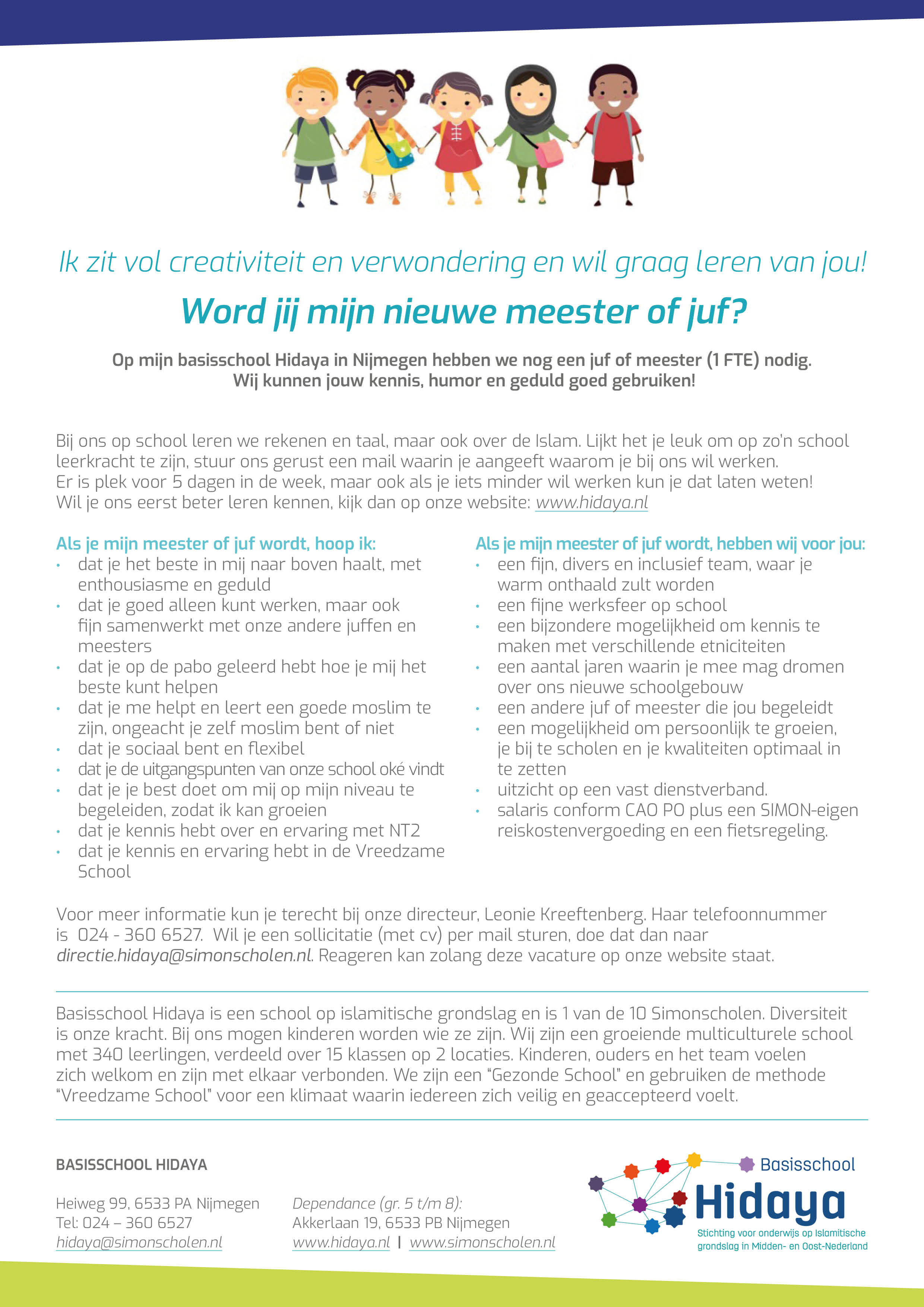 Voor meer informatie kun je terecht bij onze directeur. Leonie Kreeftenberg. Haar telefoonnummer is 024-3606527. Wil je een sollicitatie (met cv) per mail sturen doe dat dan directie.hidaya@simonscholen.nl. Reageren kan zolang deze vacature op de website staat.