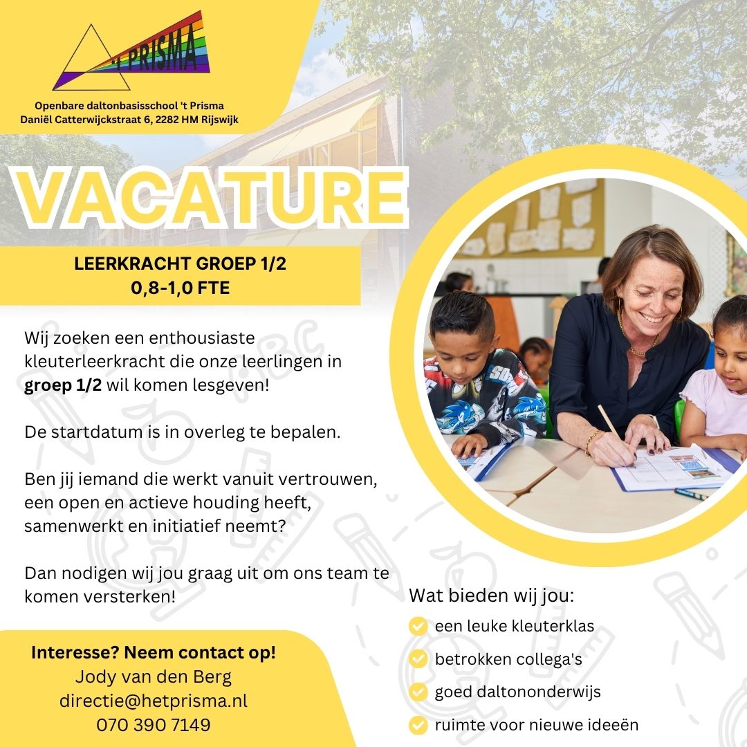 Wij zoeken een enthousiaste leerkracht die onze leerlingen in groep 1/2 wil komen lesgeven!