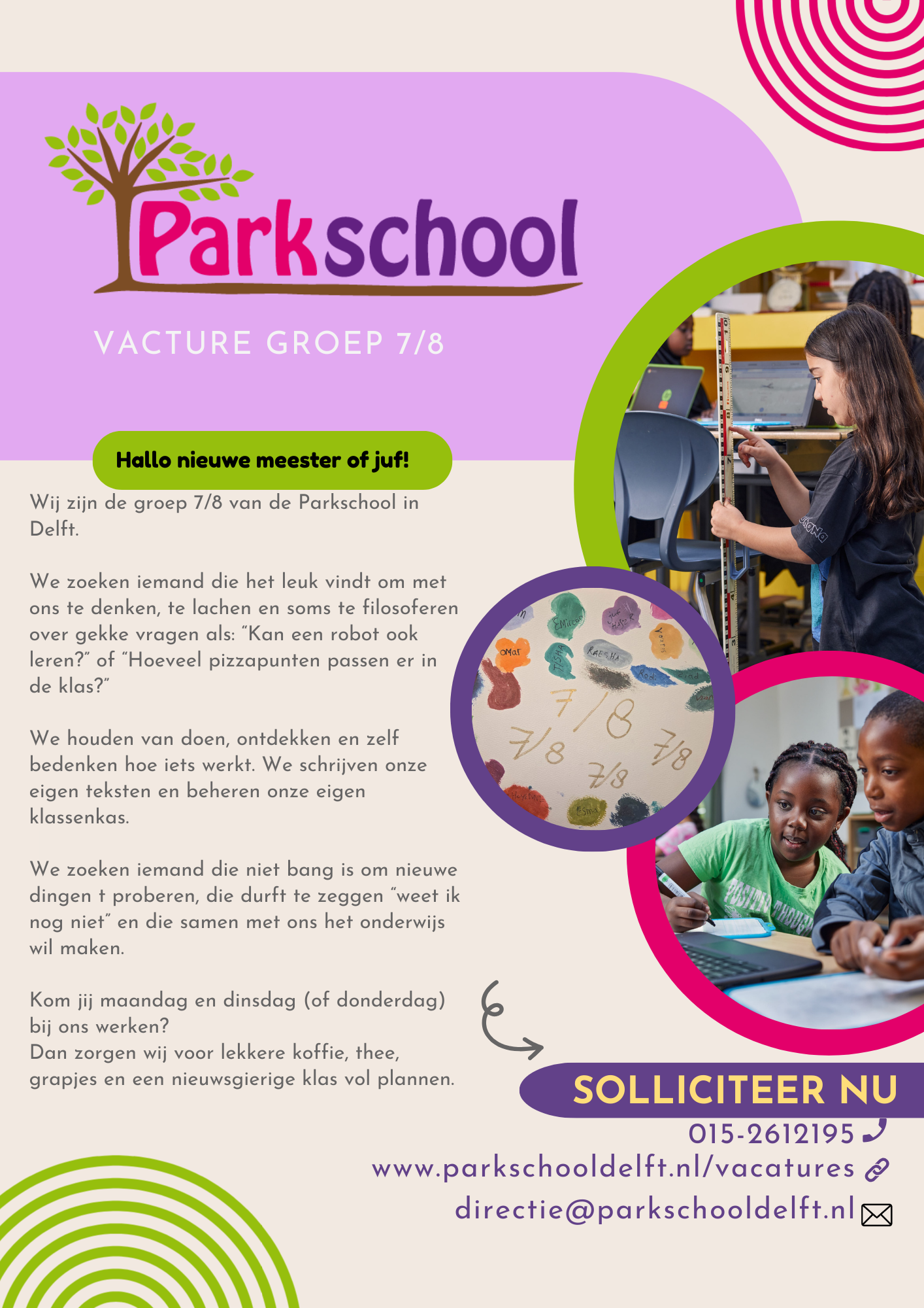 De Parkschool in Delft is op zoek naar een leerkracht voor groep 7-8 voor 0,3 of 0,4 fte op maandag en dinsdag of maandag en donderdag.